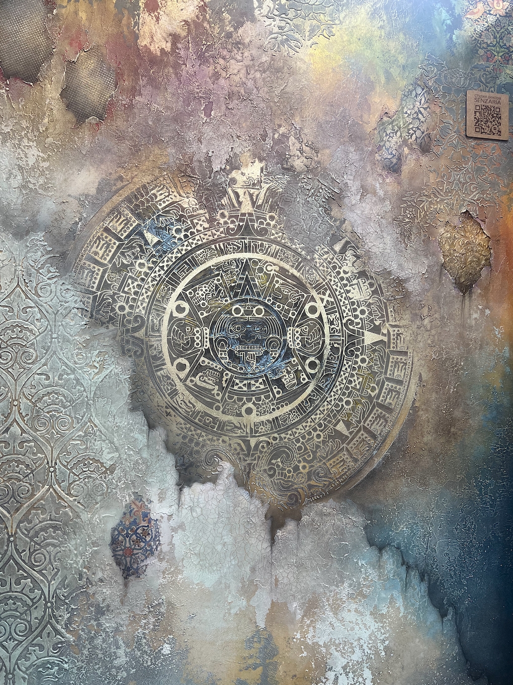 В работе постарались сочетать восточный и западный орнамент, добавили немного противостояний по цвету, эпохам и стилям, соединив их в пульсирующей мандале майянского календаря. Главный подход к работе - это разрыв указанных в битве шаблонов: восточный колорит цветов и переливов, смелые яркие акценты стали подложкой для классических и западных орнаментов, а западный приглушённый натуральный эко стиль вписался, как величественный и белоснежный Тадж-Махал в изящные оттиски восточного орнамента, где лишь намёком просачивается золотистая патина.