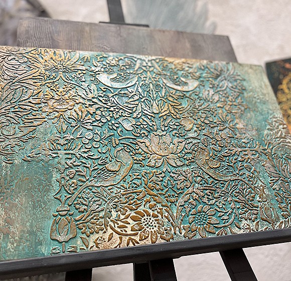 Не снимая трафарет наносим на объёмную гладкую штукатурку перламутровую цветную, снимаем трафарет. Сушим.